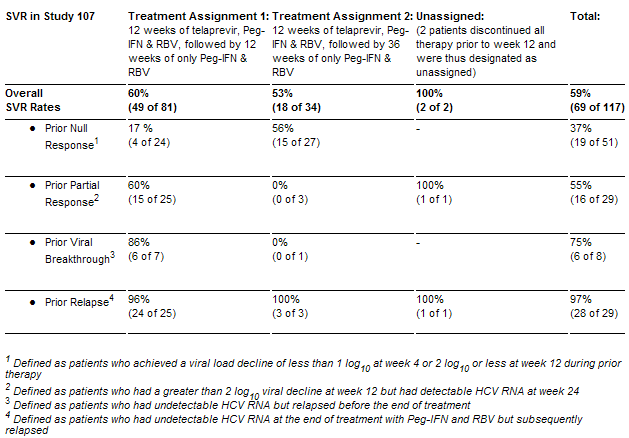 Study 107 was an open-label, Phase 2 rollover study of telaprevir in combination with Peg-IFN and RBV in patients who had previously received treatment with Peg-IFN and RBV in the control arms of either of the PROVE 1, PROVE 2 or PROVE 3 trials, and did not achieve SVR. Patients in Study 107 were well-characterized as null responders, partial responders, relapsers or breakthroughs, based on their antiviral response documented as a result of their participation in the control arms of the PROVE clinical trials.